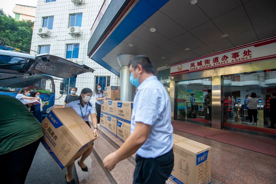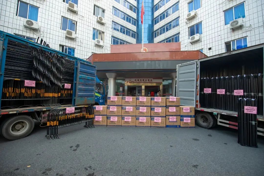 兩輛滿載愛(ài)心物資的車輛停在鳳城街道辦事處,工作人員一起卸載、搬運(yùn)抗疫物資,現(xiàn)場(chǎng)暖意融融。此次捐贈(zèng)的抗疫物資有鐵馬、帳篷、醫(yī)用防護(hù)面屏、隔離衣等等。